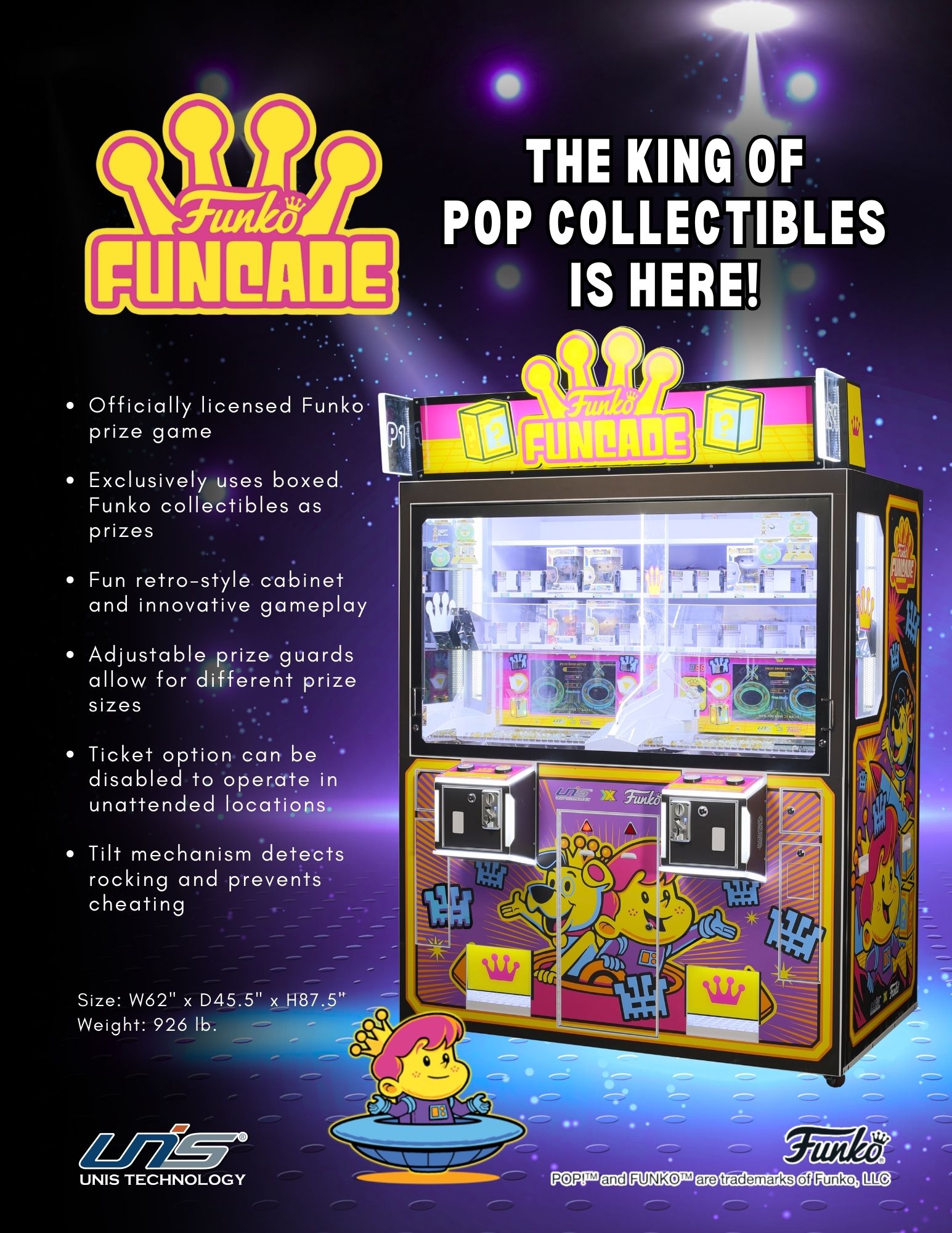 Funko Funcade is our latest prize game created in collaboration with Funko, featuring a retro game-style cabinet and innovative gameplay exclusively designed for Funko collectibles. With its two-player setup and diverse prize variants, Funcade offers a unique gaming experience that merges the thrill of arcade entertainment with the excitement of collectible toys!