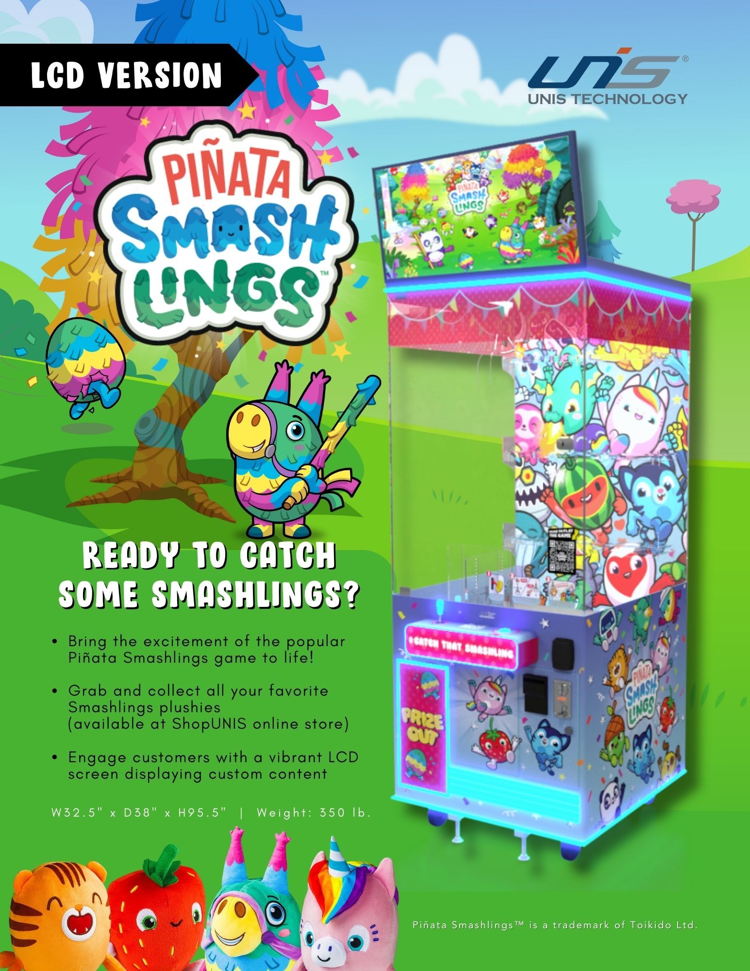 Step into the world of Roblox with Piñata Smashlings! This brand-new crane machine brings the excitement of the popular game to life, allowing players to grab and collect all their favorite Smashlings plush. Engage customers with a vibrant LCD screen and innovative linking technology for an unforgettable experience.