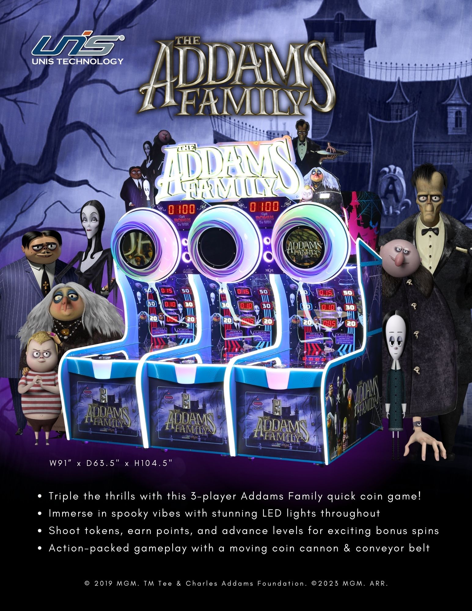 Step into the eerie world of the Addams Family with our officially licensed coin-op game. Get ready for triple the excitement as you embark on a thrilling adventure with Gomez, Morticia, and the rest of the family.