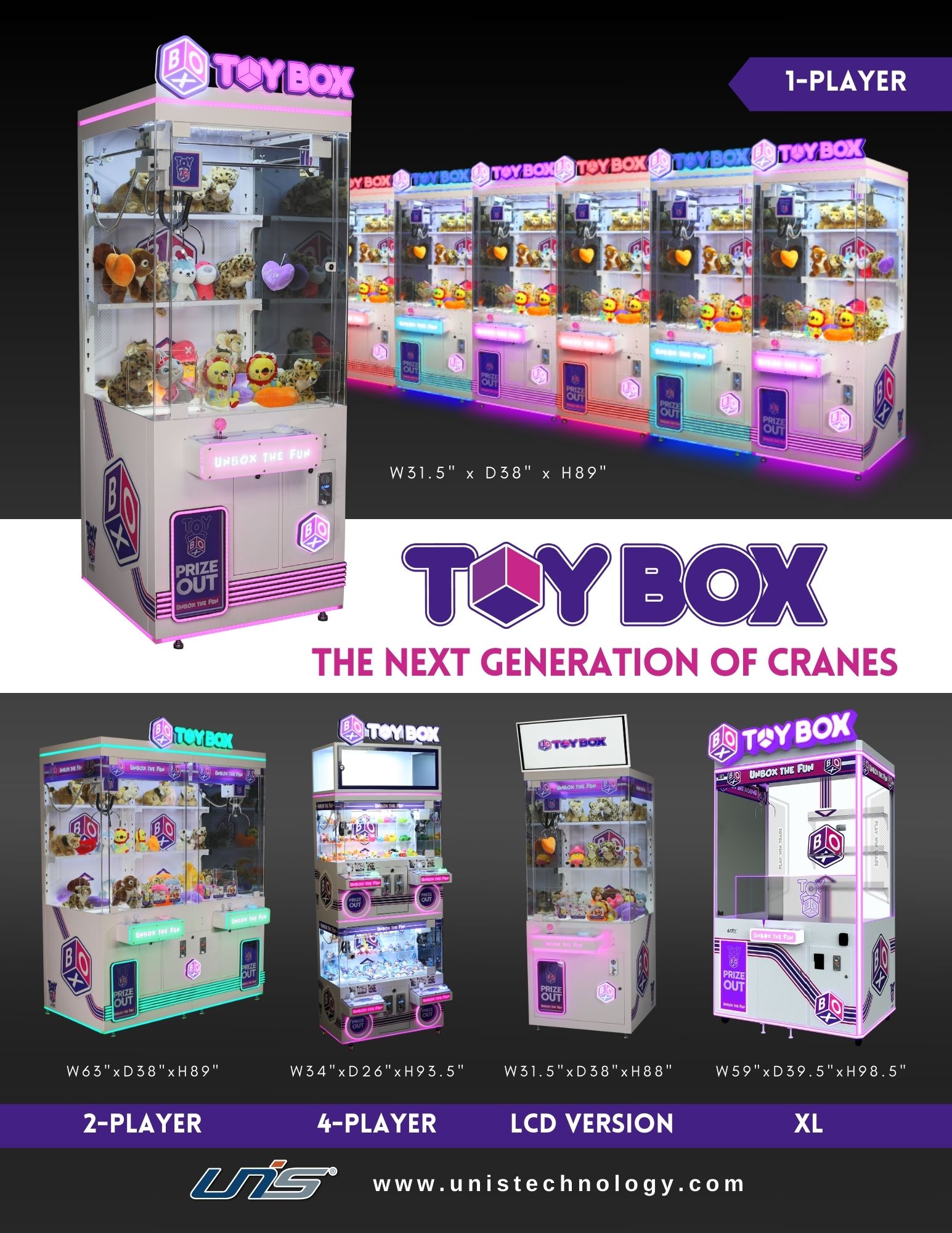 Toy Box is a groundbreaking series of crane machines that redefine arcade entertainment. Offering 1P, 2P, 4P, LCD and XL options, discover why Toy Box stands out in the world of claw machines. With its unparalleled versatility, customizable lighting options, claw adaptability, and dynamic setup, Toy Box offers an unmatched experience you won’t find anywhere else.