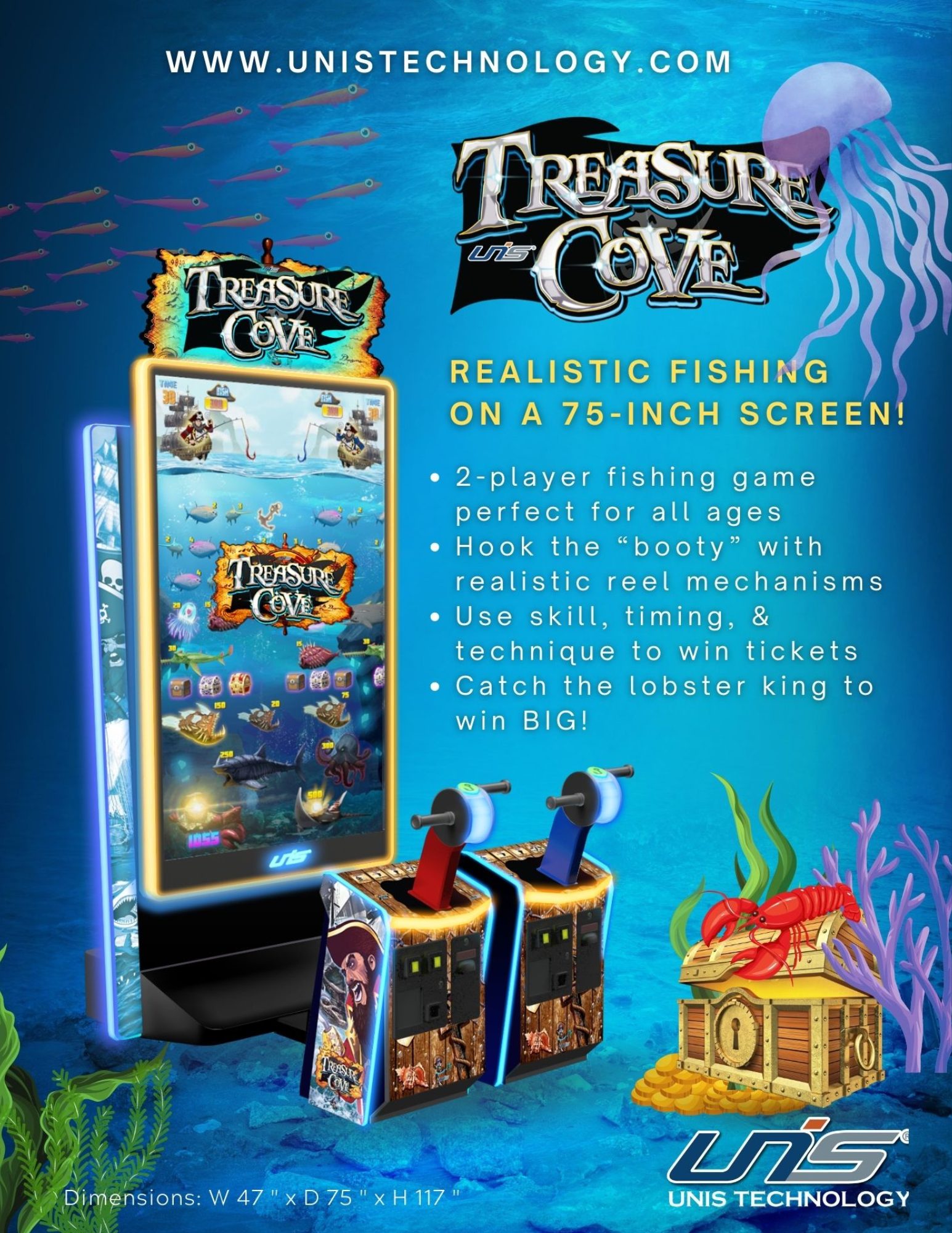 Treasure Cove is a 2-player arcade video fishing game. Players assume the role of skilled anglers, leveraging realistic reel tension to hook a variety of underwater treasures. The impressive 75” LED monitor brings the underwater world to life. With stunning graphics and detailed animations, you’ll feel like you’re really sailing the high seas.